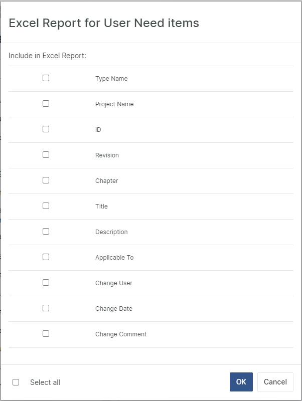 Select the Generate Excel Report menu item in the corresponding View. Then select the Document Objects to include in the report.