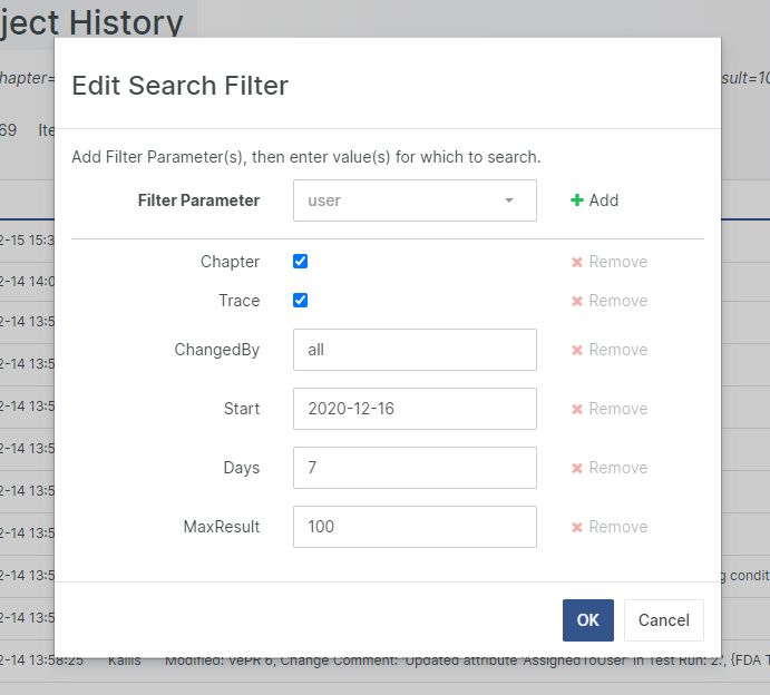 Filter options can be used to refine the output of the Project History. Click on the Filter caption to open the Filter Dialog.