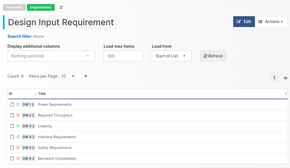 Note! The search filter settings are stored and applied again the next time you display a list for the given Design Control type.