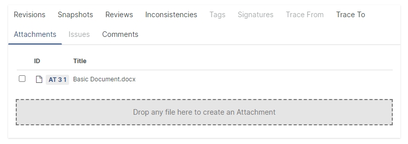 File attachments are a handy way to add additional or supportive information to a Document Object; e.g., log files as objective evidence for test executions, marketing survey data for requirements, or drawings for specifications. In Aligned Elements, Attachments are separate Document Objects that contain a File. They are added to the parent Document Object with help of a trace.