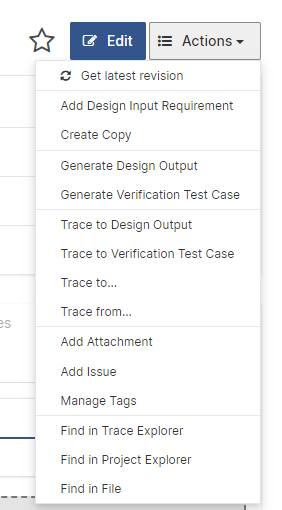 To add traces, select the Document Objects acting as a source in the trace relationship. Then click the Action button to access the Trace To... and Trace From... actions. The mechanisms for adding and removing traces are the same as described above.