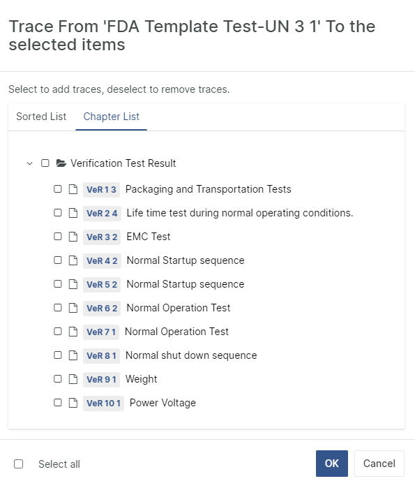 By clicking on the Chapter List Tab, the same items are displayed in their chapter structure. Select or deselect items to include in the trace set.