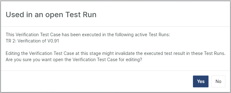However, as soon as a Test has been executed, updating the Test might invalidate the result. Therefore, when opening a Test that has been executed and is part of a non-completed Test Run, you will be duly warned that editing the Test might invalidate the current Test Result.