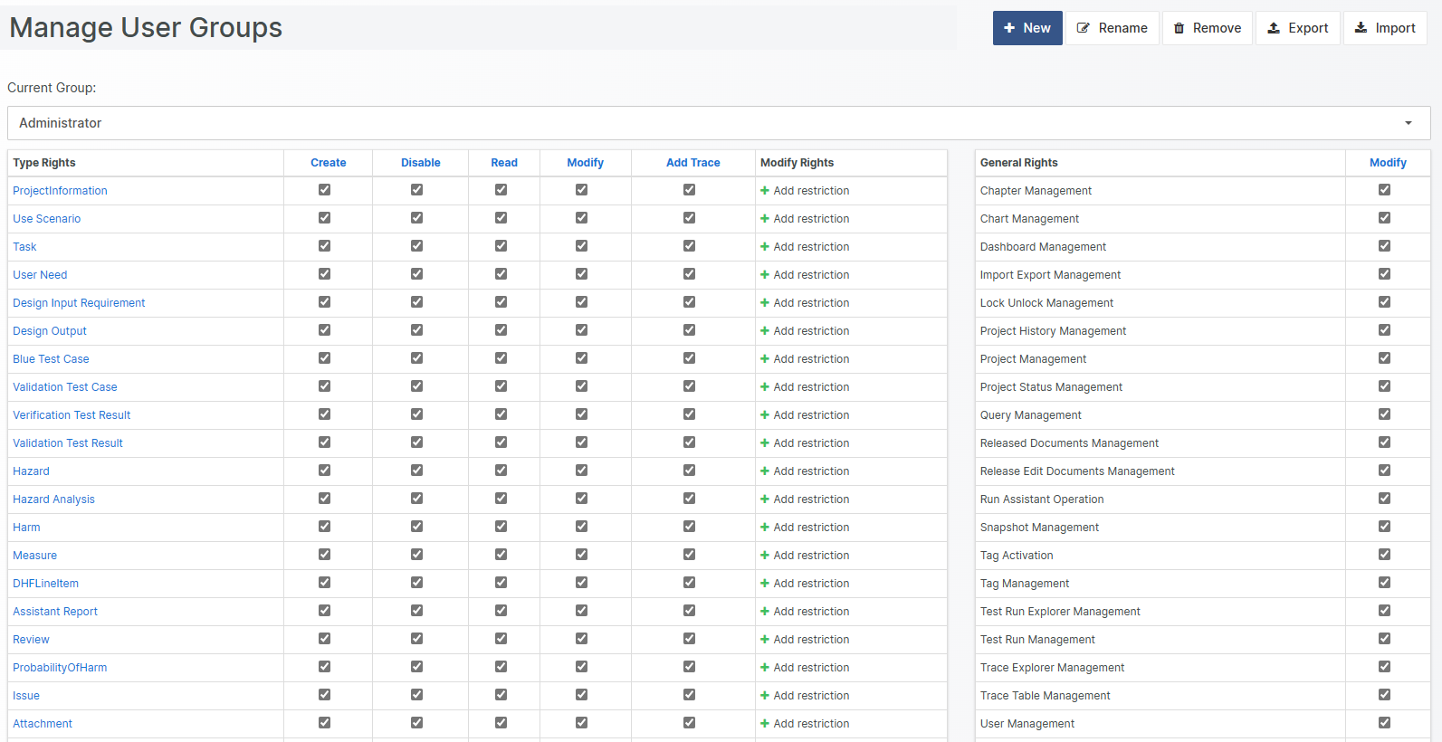 If an imported user group lacks User Rights associated with Document Object Types that exist in the target project but did not exist in the source project, those User Rights will be added with maximum permission.