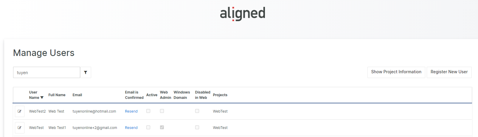 An Admin may 'Register New User' or edit an existing user where the user can be enabled/disabled and the email address may be corrected. It is also possible to initiate a resend of the confirmation email for a user from the 'Manage Users' view. Additionally, the view presents a summary of which projects the user is assigned. This additional project specific information is possible to hide using the action 'Show/Hide Project Information'.