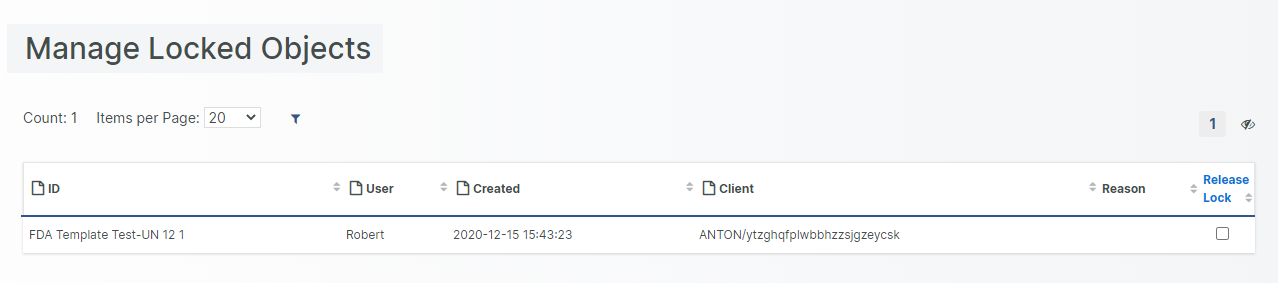 The Unlock Objects view displays the currently locked Document Objects, together with information about who has locked the Document Object and when that lock was initiated.