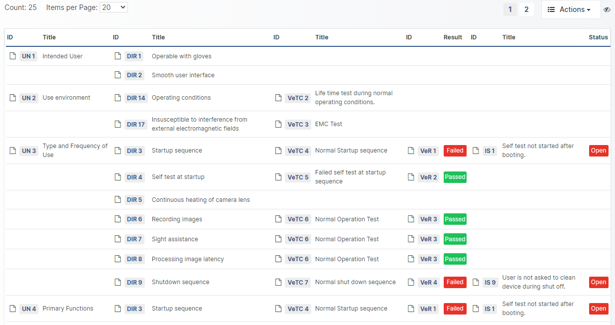 A Trace Table is a table where the traceability between Document Objects is depicted as table rows, showing the trace chain from left to right. In Aligned Element you can create, run, modify, export, import, delete and save Trace Tables as Word Templates.