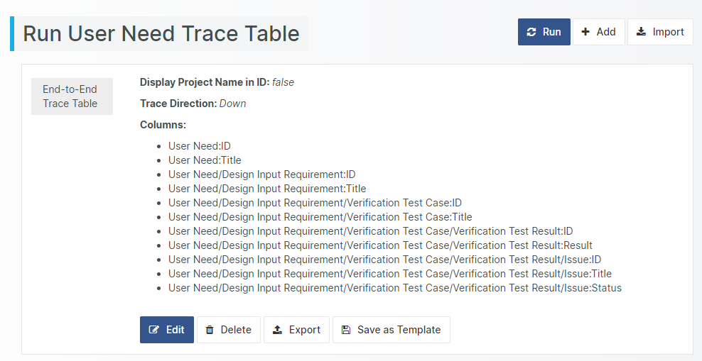Click on the Save as Template button to save the currently selected Trace Table definition as a Word Trace Table Template to be used in the Word Add-in.