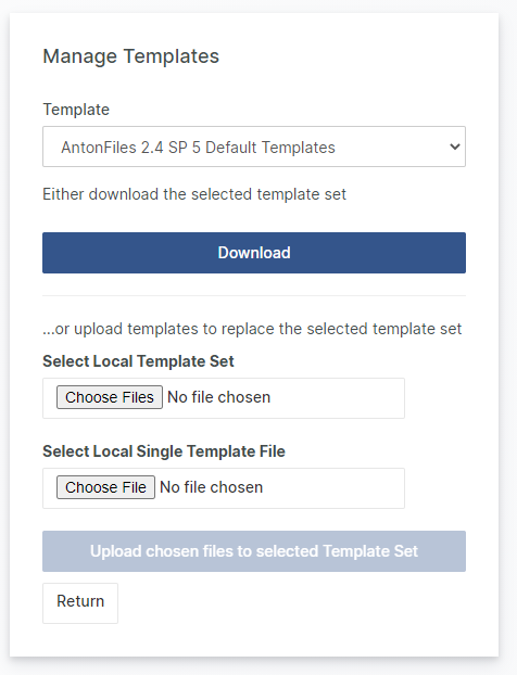 All users have the ability to download templates from the server. This is mainly intended for support purposes. The downloaded template set is packed in a zip file. The Download Templates ability can be enabled/disabled in the web.config using the application setting 'showManageTemplates'.