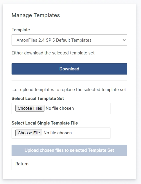 To upload a single template file, select the template set on which to operate in the Templates drop down list.