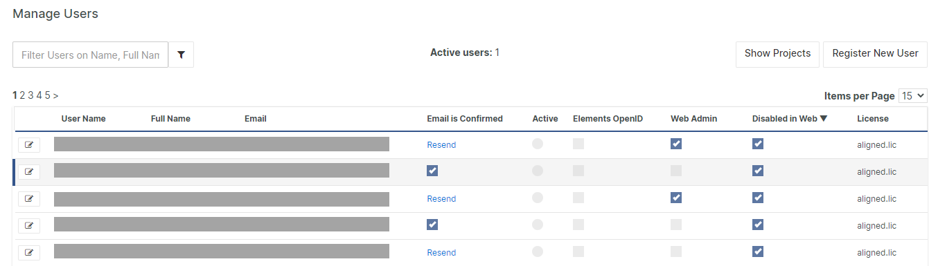 In the Manage Users view, a Web-admin may edit a few properties for a user such as Full Name, Email, Disabled, License (optional, only visible if multiple licenses exists) and Project.