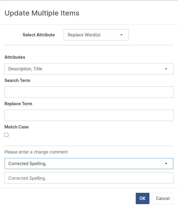 In the Update Multiple Items dialogue, select the Replace Word(s) in the attribute dropdown.