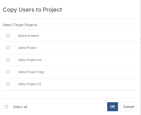 To copy users to a different project, click the Copy to Projects button. Select the Users to copy in the leftmost Copy column and optionally tick the Overwrite existing Users checkbox above the table. Once one or more Users have been selected, click Save and select the Target Projects in the displayed dialog.