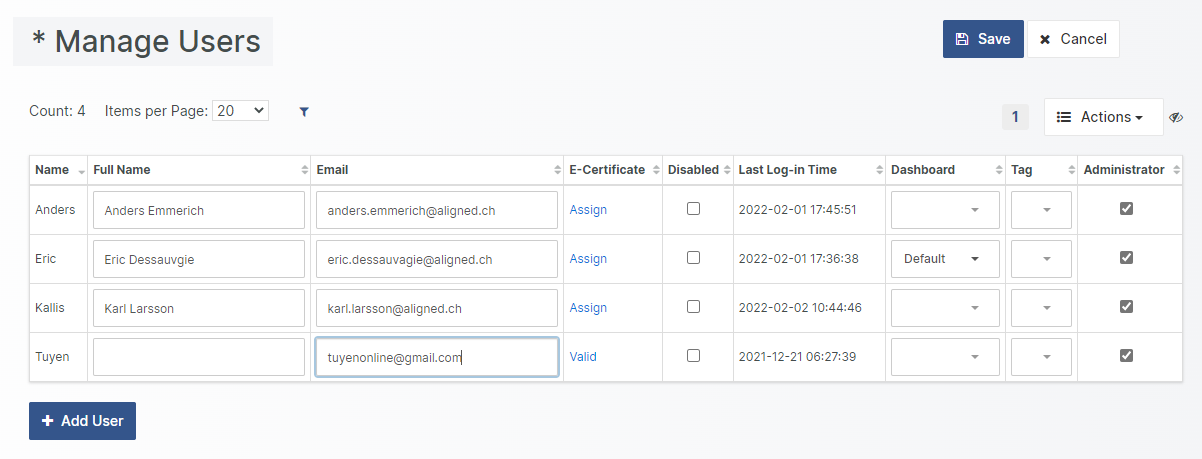 In the Navigation Bar, select Settings => Manage Users, to access the User Management view. Here you may add, modify and disable users.