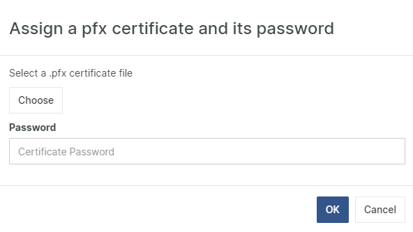 In conjunction with uploading the certificate, the password of the certificate has to be added. If the certificate and password are valid, the Assign link will change to Valid. If the certificate should expire, the Valid link is changed to Invalid.