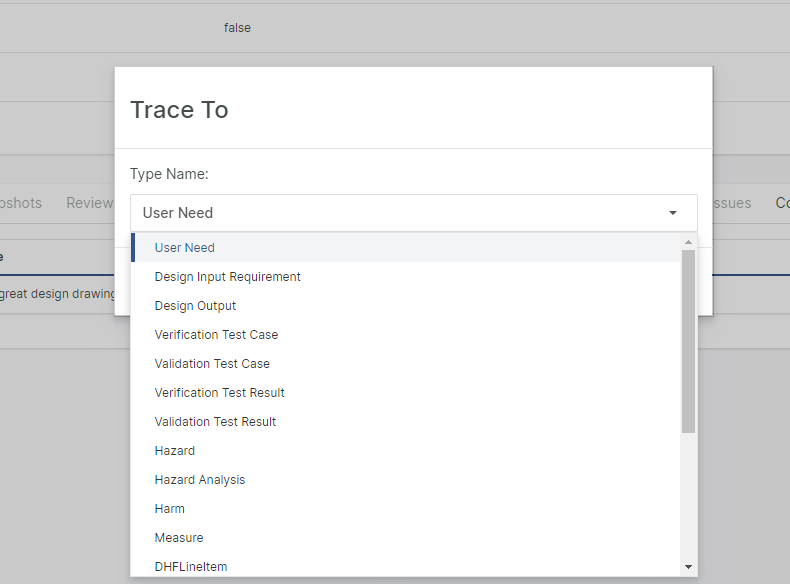 If the desired trace type is not available as a designated trace option, use the Trace To... or Trace From... menu item. After clicking the menu item, select the type name of the Document Object for which you want to manage the trace.