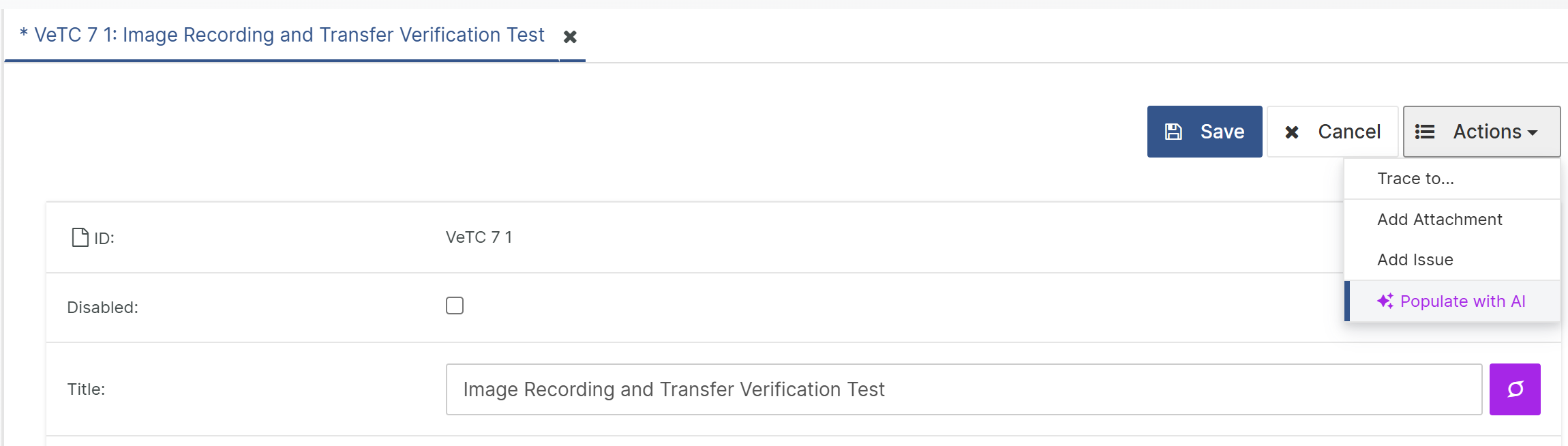 To use this function, edit a document object, go to the "Actions" menu, and select "Populate with AI". You can then review and further edit the attributes as needed before saving.