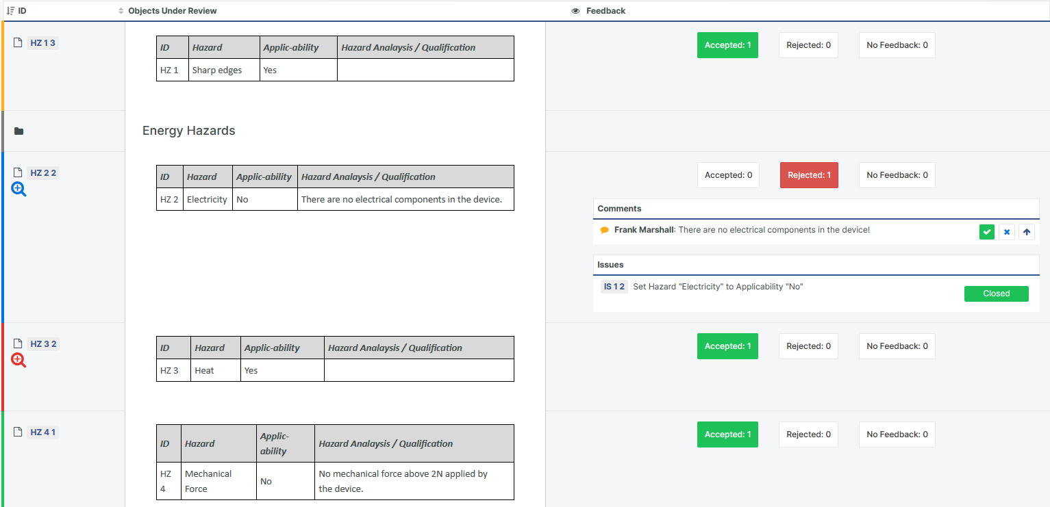 The issue is associated with both the Document Object under review and the Review itself, and is to be regarded as a Review Finding to be formally addressed during the Review. Existing Issues can also be entered, added, and removed from the item by using the Square Speech Bubble.