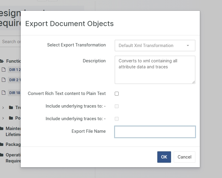 When exporting Failure mode-like or Risk Analysis-like objects, the user is inquired if the traced Hazard and Mitigation objects should automatically be included in the exported set. Since Failure mode-like objects are closely tied to the traced Hazard objects, it is recommended to include these during export.