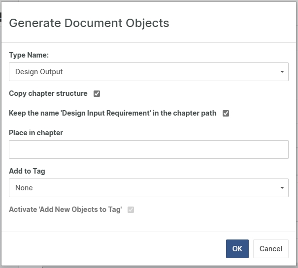 With the selection completed, the Generate Document Objects dialog is displayed.
