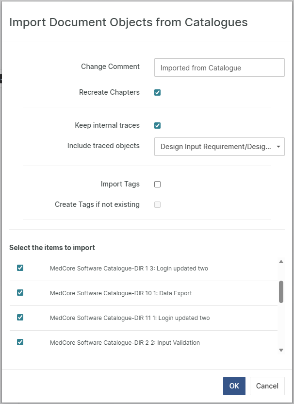The import dialog has many similarities with the regular Import Document Objects dialog. The options Change Comment, Recreate Chapters, Import Tags and Create Tags if not existing works in the same way as in Import Document Objects.