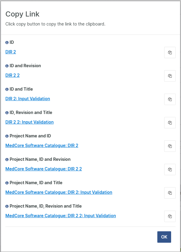 Click Copy Link to access a list of possible links. Pick a link that suits your purpose depending on wether it shall include the project name, revision and/or title.