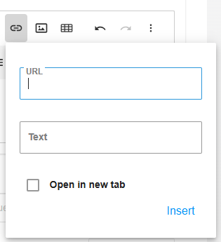 Use the hyperlink control to insert hyperlinks. You can set the URL and choose whether it opens in a new tab.