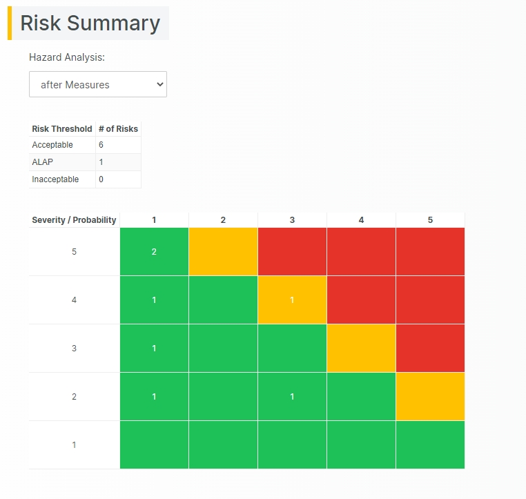 The Risk Summary displays the number of risks in the three regions Acceptable (Green), optionally ALAP (As Low As Possible), and Inacceptable (Red).