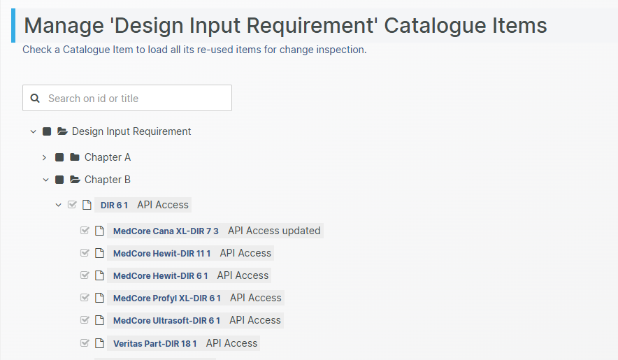 If you have an item that is in a lower revision in the re-use items, you can inspect and compare the state of the Catalogue Item vis a vis the re-used item by clicking on the blue looking glass icon.