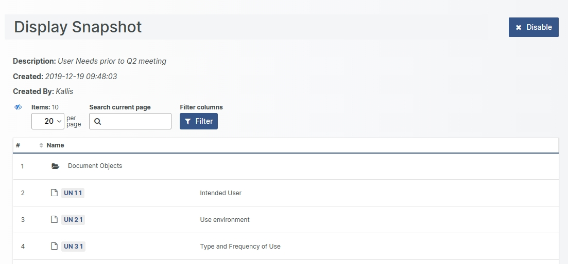 Snapshots that are not part of non-disabled Reviews can be disabled by users that have Project Management permissions. Click Disable and confirm to disable the snapshot.