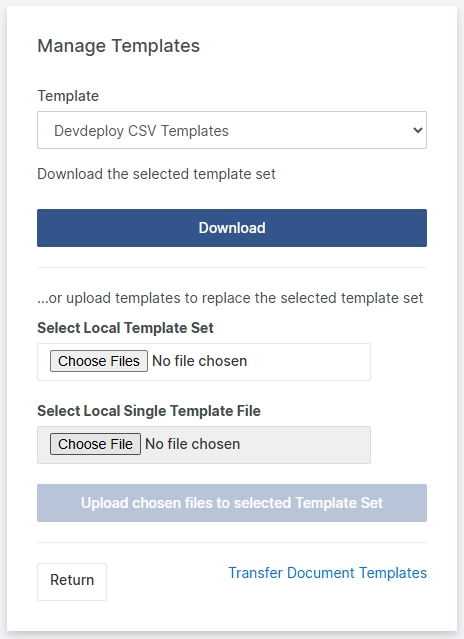 Transfer Templates makes it possible to transfer files located in the Template set's Document Templates subfolder (containing the Document templates selectable when clicking on a File Attribute Browse Templates button in a File Object) to the Document Templates of another Template set.