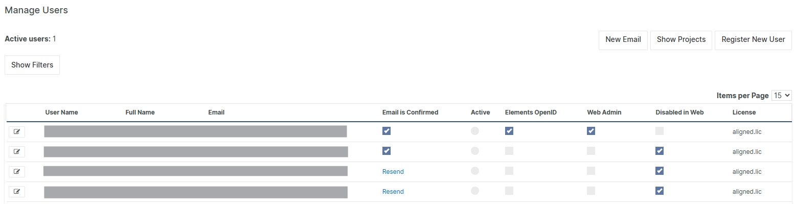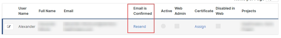 The Administrator can resend the email to the user by clicking the Resend link in the Email is Confirmed column, should the user not be able to find the email or if the activation email has expired.