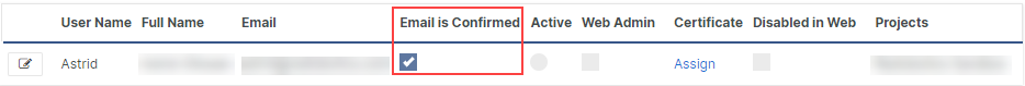 If a user has not yet completed the activation of his/her user account, it is also possible to trigger a Resend of the confirmation email from the view by clicking Resend in the Email is Confirmed column.