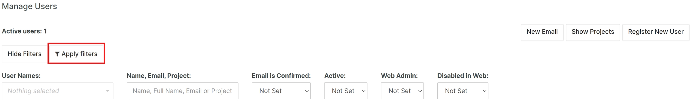 You can refine the user list by applying various filters, such as name, project, or email confirmation status.