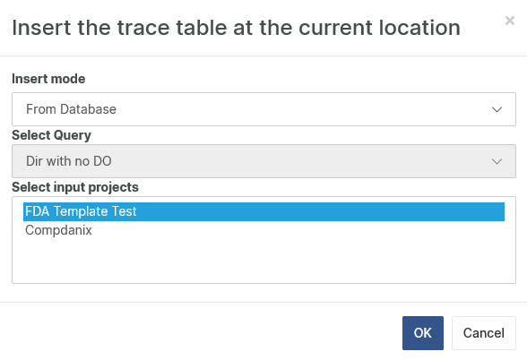 To create a trace table in your document at the cursor location, select the Insert Trace Table < name of the trace table> from the Trace Table dropdown button in the Word Add-In toolbar.