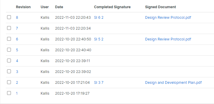 The File Object Revision Tab shows which Revisions of the File that lead to completed signatures.